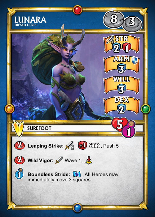 Homemade SDE cards for Lunara, based on the stats of the Thundervale Huntress.